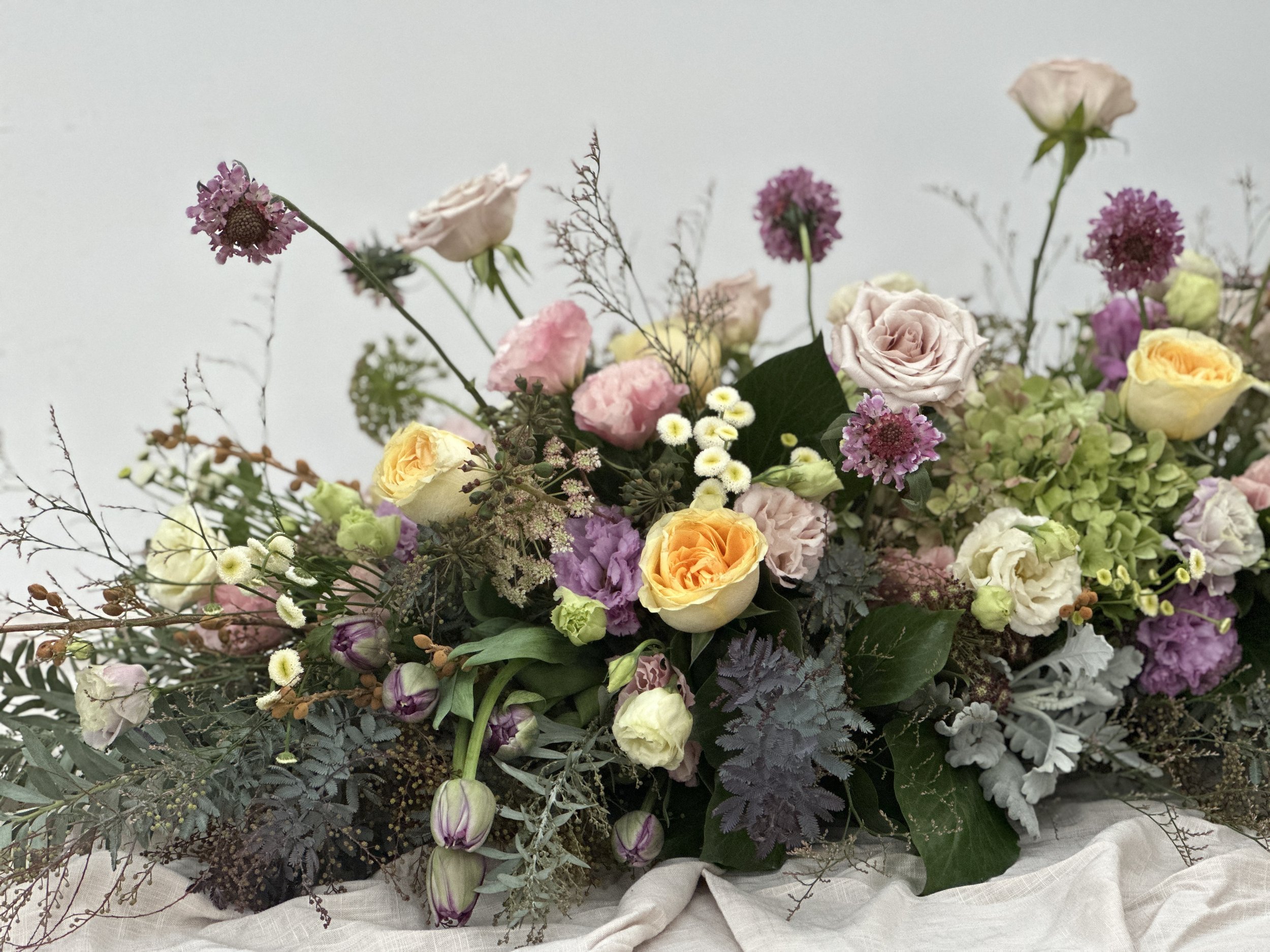 Our garden-inspired tributes are abundant with fresh seasonal flowers, garden textures and gathered foliage. Designed to rest beautifully upon the top of the casket, each arrangement is composed in our signature Violet and the Fox style, loose, organic and quietly elegant, a small garden in itself.
